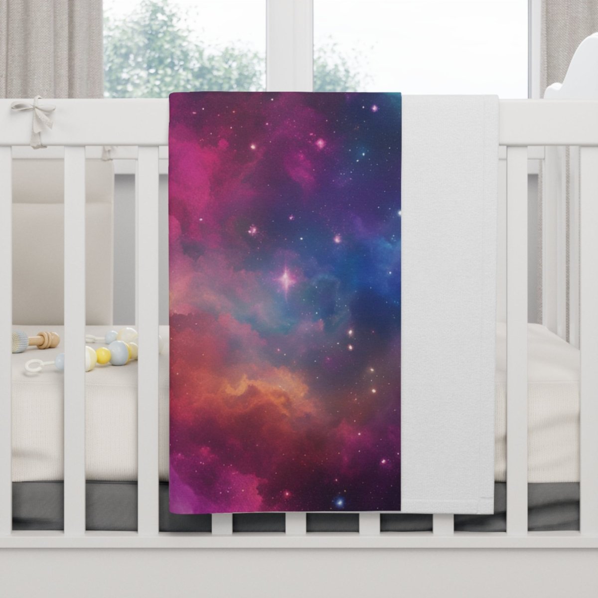 Wrap your baby in cosmic comfort with our Galaxy Fleece Baby Blanket. Featuring a stunning galaxy print, this ultra-soft and cozy blanket is perfect for snuggles, naps, and stroller rides. Lightweight, durable, and machine washable, it's a stylish must-have for any nursery. Let your little one drift off to dreamland among the stars! ✨️