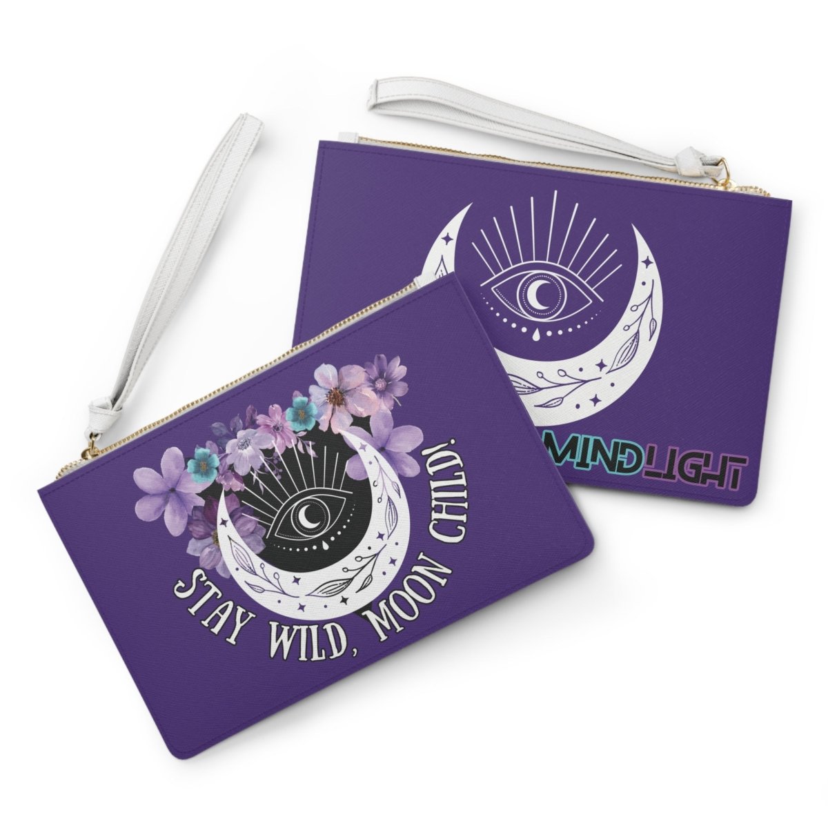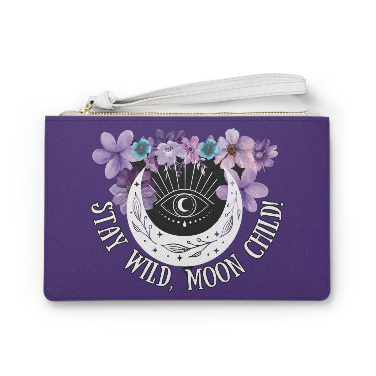 Check out this Moon Child Clutch Bag! It's a must-have for fashionistas dashing around town, featuring a chic loop handle, a snazzy zip closure, and crafted from vegan leather with a cool Saffiano pattern. Perfect for stashing your phone, wallet, and keys in style!