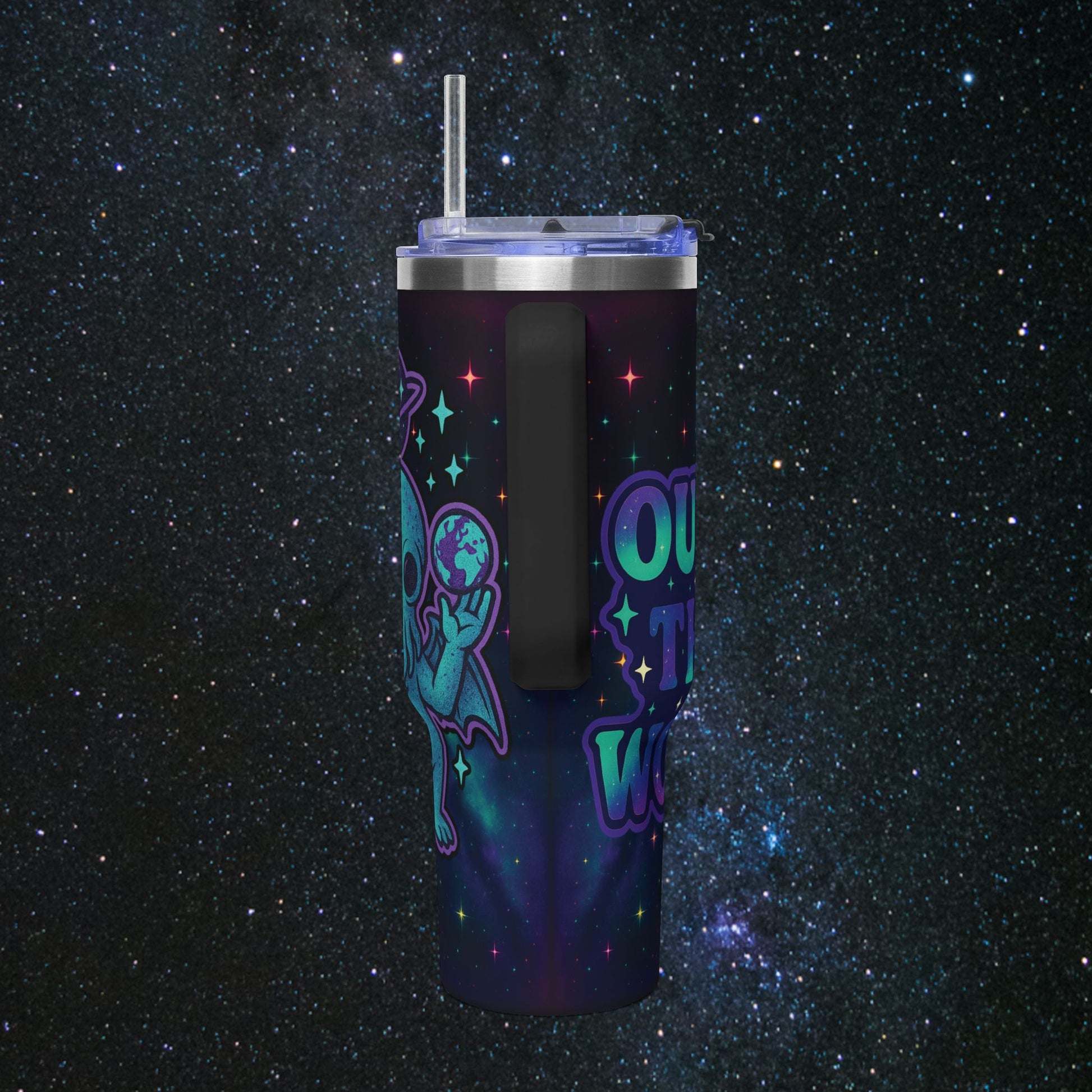 The Outta This World Tumbler features bold, retro-inspired lettering floating across a star-filled galaxy, radiating color, humor, and cosmic confidence. It’s a reminder that you don’t have to fit in—you were never meant to.